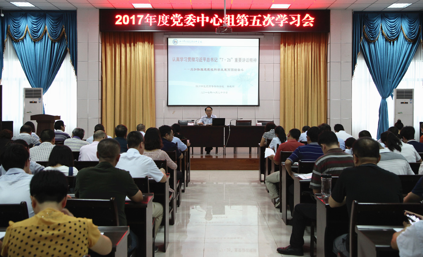 8月26日,学校党委召开2017年度第五次中心组学习会,党委书记秦晓明在会上作《认真学习贯彻习近平总书记“7·26”重要讲话精神——为加快推进我校科学发展而团结奋斗》专题辅导报告。全体校领导、中层干部,副高以上职称专业技术人员、博士、教研室主任等120余人参加学习。