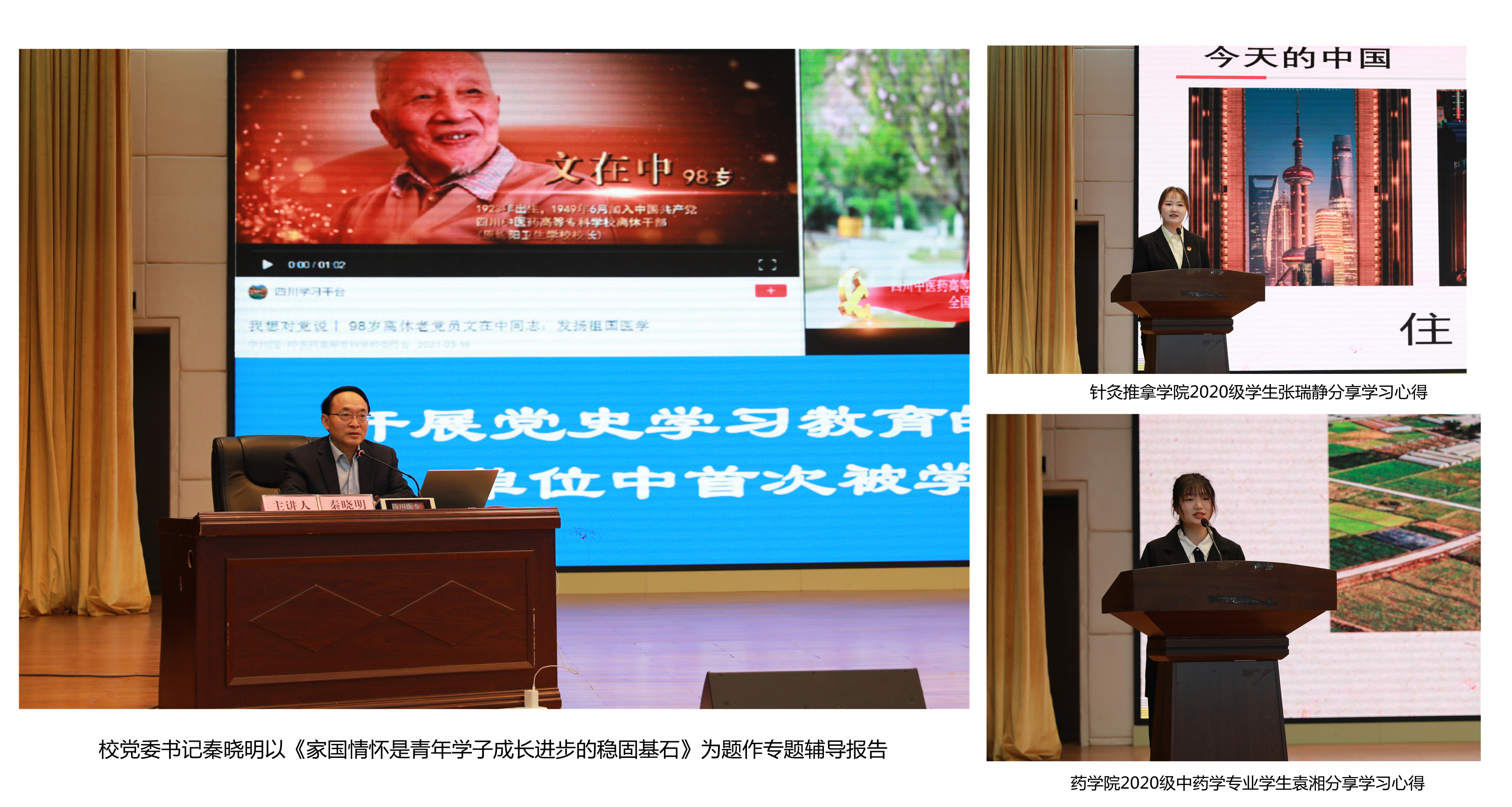 3月3日,我校开展了“传承红色血脉 厚植大医情怀”师生联台讲党史主题活动,校党委书记秦晓明与药学院、针灸推拿学院2020级两名学生同台讲党史,校党委办、宣传部、学工部、校团委、各学院党团负责人,以及我校专兼职辅导员、各学院学生代表现场聆听,同时还通过网络平台向全校师生直播。活动由校党委副书记汪涌泉主持。