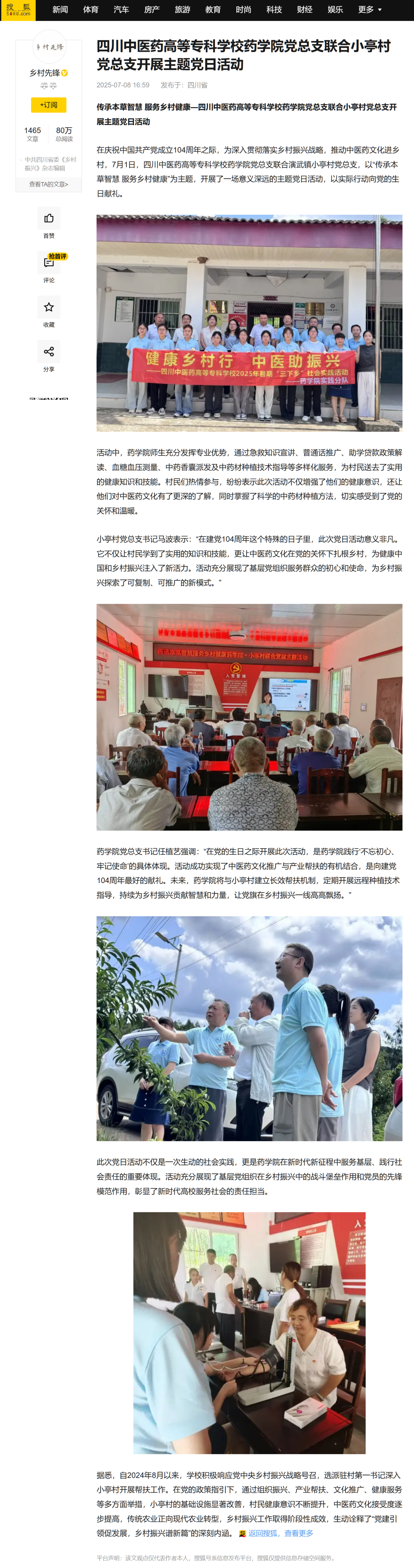 搜狐:四川中医药高等专科学校药学院党总支联合小亭村党总支开展主题党日活动