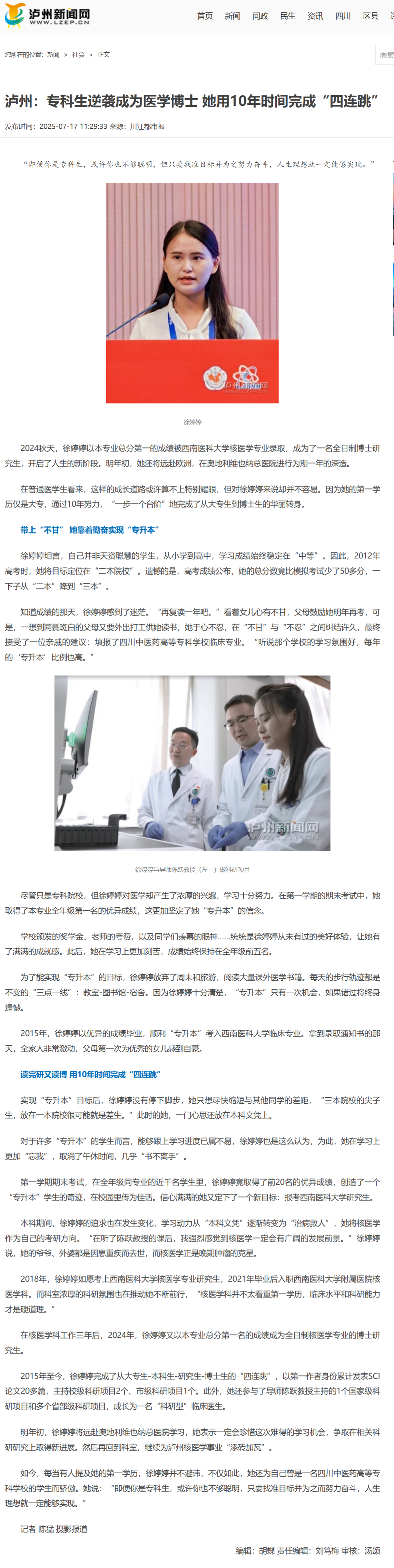 泸州新闻网:专科生逆袭成为医学博士 她用10年时间完成“四连跳”