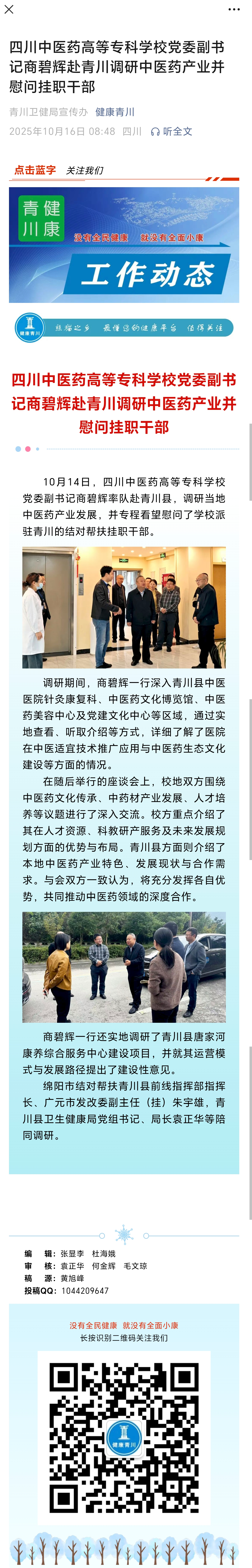 健康青川:四川中医药高等专科学校党委副书记商碧辉赴青川调研中医药产业并慰问挂职干部