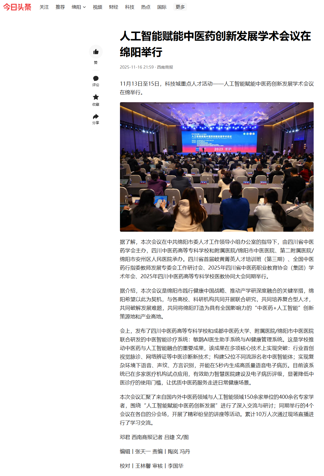 今日头条:人工智能赋能中医药创新发展学术会议在绵阳举行