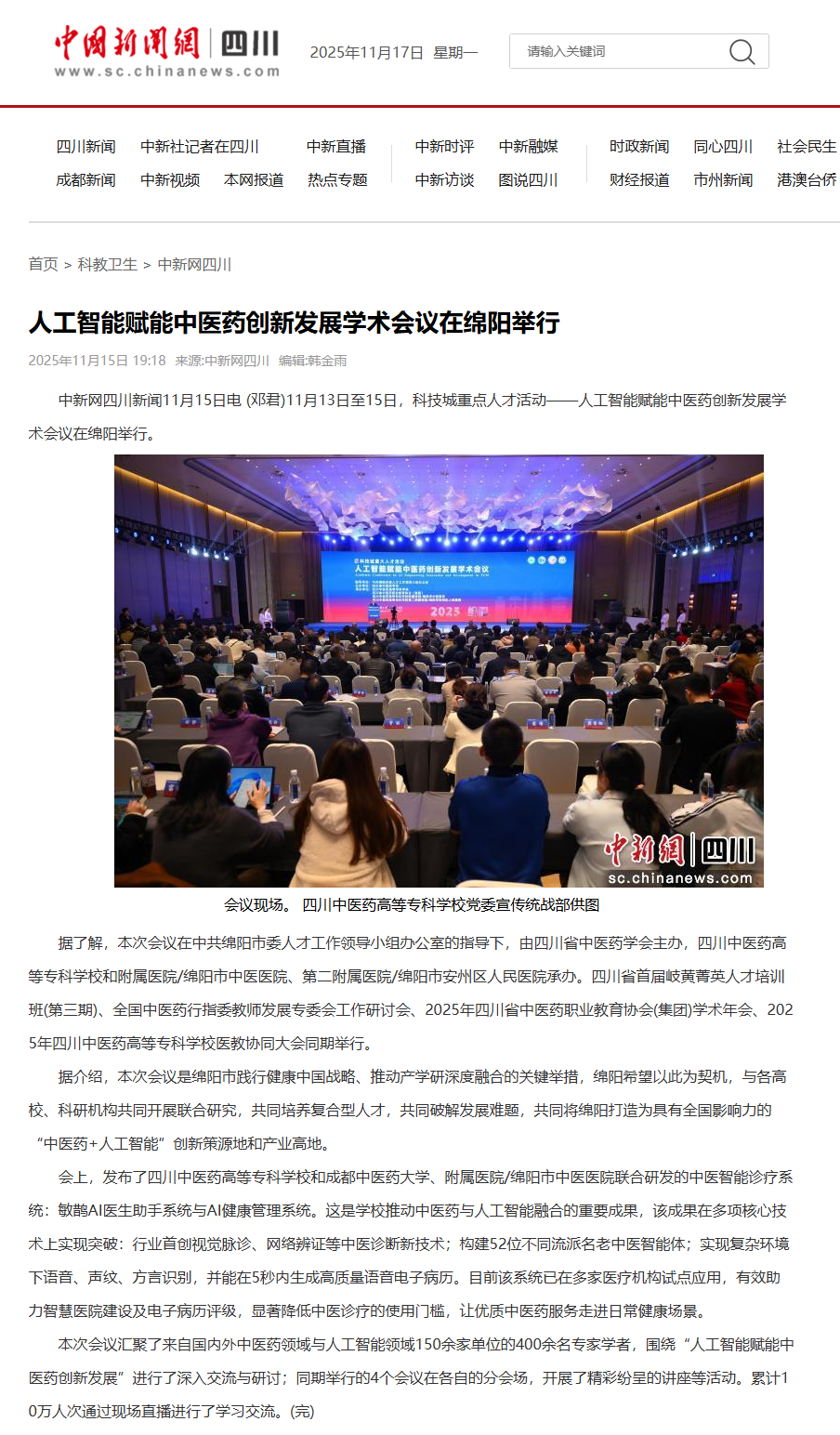 中国新闻网:人工智能赋能中医药创新发展学术会议在绵阳举行